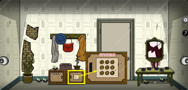 4、打开景中间桌子下右边的柜子,柜子需要按照顺序点击上面的按钮才能打开,打开柜子的密码是371856249,打开柜子得到【美工刀】。