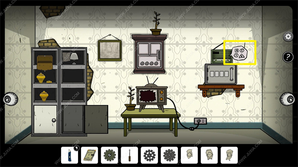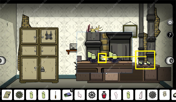 22、在电视机场景左边柜子下方的左右两个格子中分别拿到【齿轮】和【剪刀】。