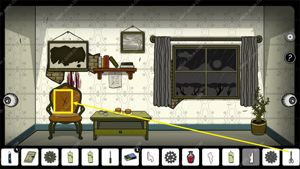 23、回到窗户场景,用剪刀将场景内左侧的椅子靠背画“×”处剪开,得到【纸片】。