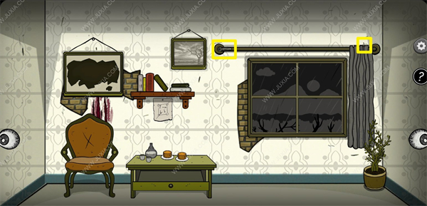 12、左转回到窗户场景,将【窗帘布】挂在窗帘杆的左侧,同时在中间的桌子上拿到【水瓶】。点击刚挂上的窗帘可以看到窗帘上的图案线索。
