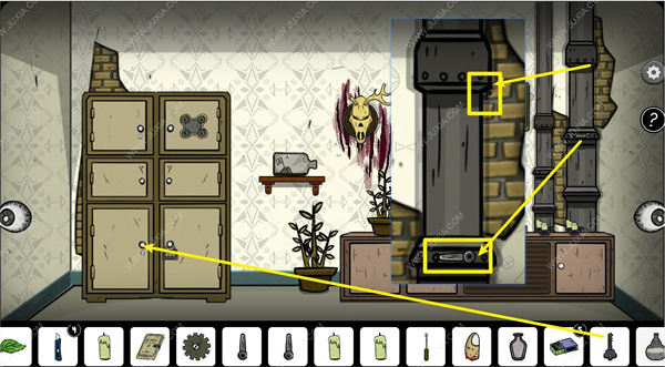 19、回到时钟场景,用刚才在厨房场景中得到的钥匙,打开时钟场景左侧立柜下方左边的格子,得到【镜片】。