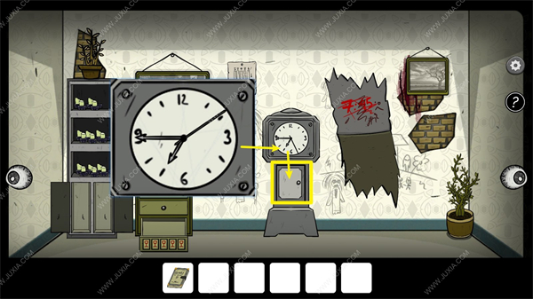 43、调整好之后时钟回复转动,随后用【美工刀】将时钟右侧墙壁上被划痕覆盖的人头草图处划开,得到时间信息。