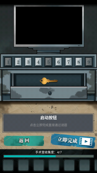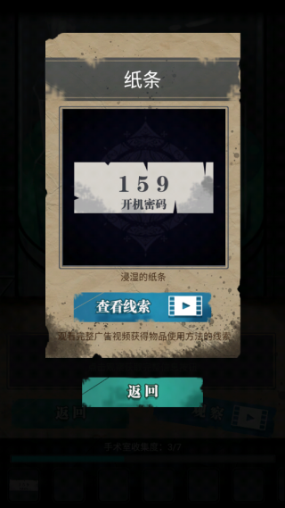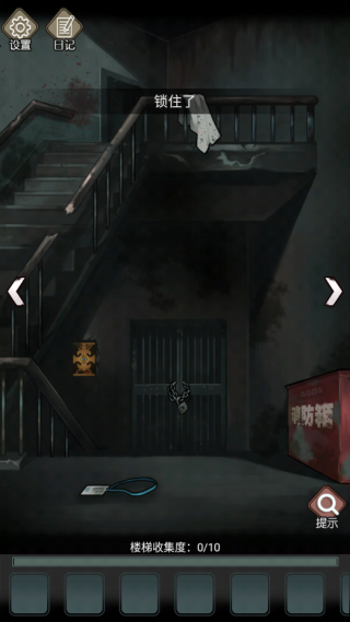 4、点击前面的门,安上把手,玩游戏开门(目前好像只能看广告开),捡起门下面的红色密码牌。这个场景就结束了,可以转换场景了,但它下面的收集显示差一个,这个就要你点下方的日记本并且看日记(看广告,点日记中间看广告,不是观察的广告)