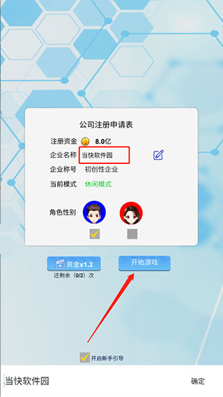 3、注册企业,填写企业名称、选择角色性别,点击开始游戏;