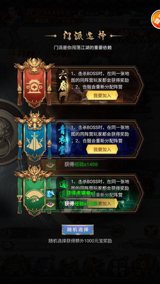 5、游戏中有三个门派,玩家可以根据自己的想法加入,随机加入可以额外获得1000元宝奖励