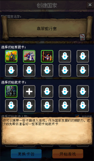 1、创建自己国家时,玩家可以携带一些卡牌作为初期助力带入游戏