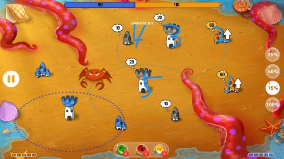 2、进入关卡之后,根据系统的提示进行游戏,占领完对方的单位/首先占领某个特殊的建筑单位!操作非常简单,只需要拖动已方单位到敌方单位/未被占领的单位即可。