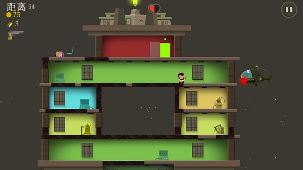 游戏让大家体验到了只需一手操控也能感受猛烈撞击的快感,刚开始贴心的新手教程也足矣让玩家一目了然,只需上下滑动屏幕,便可操控这位大胡子上下跳跃来回穿梭撞击在各个楼层之间,并在躲避敌人的攻击同时攻击敌方解救人类。