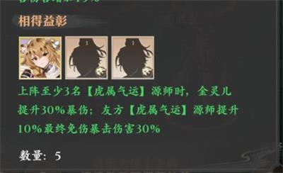 金灵儿作为这个队伍的核心角色不仅能和其他两名以上的虎属气运角色组成提高高额爆伤和免伤的羁绊,自身达到七星和绝1时还能分别提高20%和40%的暴击率。