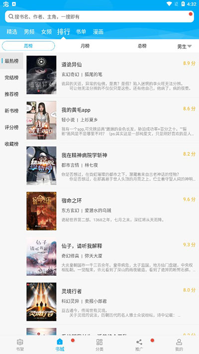 除了普通的小说分类,还有“男生”和“女生”两个细分的分类,便于用户查找自己感兴趣的小说;