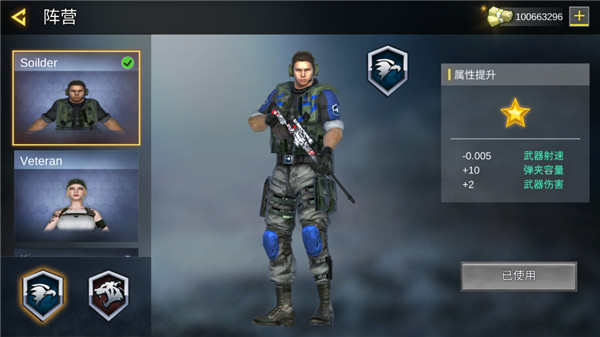 1、打开在本站下载的打击力量英雄破解版,进入首页我们可以看到有阵营、排行榜、武器库等等功能板块,我们可以先点击齿轮状的设置键