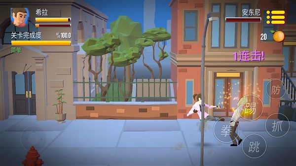 简单的键位设置就是左侧的虚拟摇杆控制方向,右侧则是单独的按钮来打出不同的连招组合,比如踢、拳、抓、跳、防,各项按钮单独放置,这样便于玩家更好的操作,每当成功挑战关卡便可获得橘子,另外进入游戏的左上方是玩家的血量,关卡的完成度以及挑战级别的难易程度。