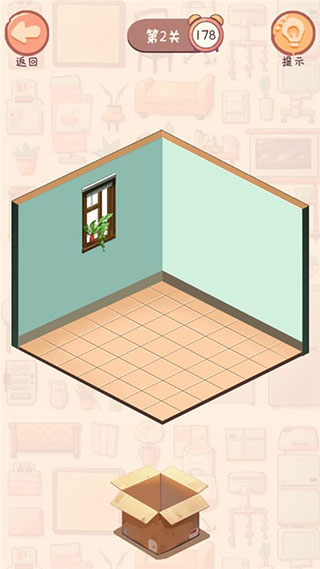 2、第一关,点击盒子,不断出来各种家具和植物,在规定的时间内将其摆放整齐。