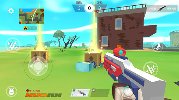 5、左上角是地图,游戏内每隔一段时间就会刷新毒圈,及时移动到安全地带,当击败了玩家之后,它的装备会掉落为盒子,如图示,靠近可以获取资源。
