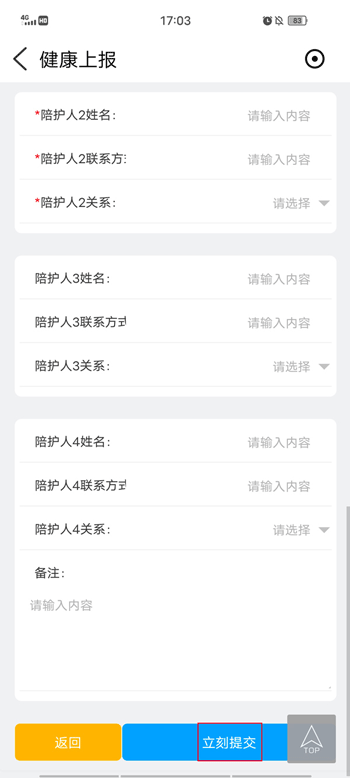 3、如家中有他人陪同,可在“目前所在地”下方的共同陪护人中依次填写名字等信息,填完点击底部的提交即可完成。