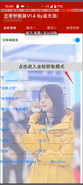 5、进入模式后,按下音量键可切换点击屏幕,再按下就无法操控屏幕,但是你会发现在上分有个坐标