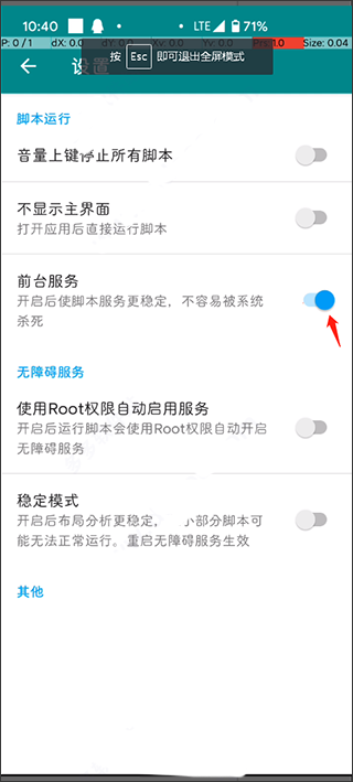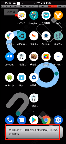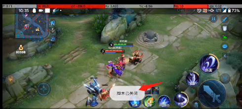2、运行后会在下方提示已启动脚本,并左上角会有很淡的悬浮按键,这时两个悬浮按键还是重叠在一起的