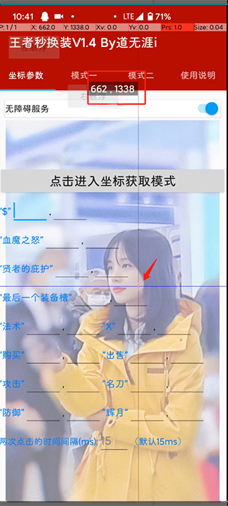 4、接着最重要的地方就是设置坐标参数,主要就是装备的坐标参数,点击进入坐标获取模式