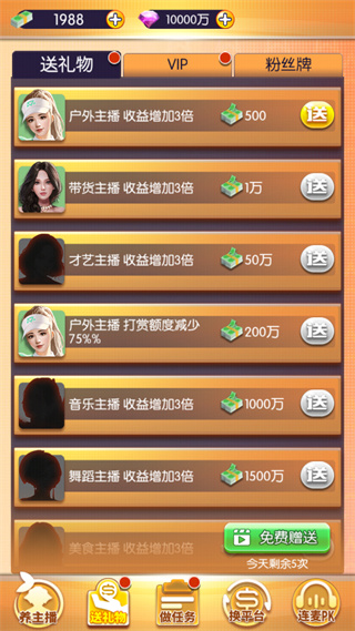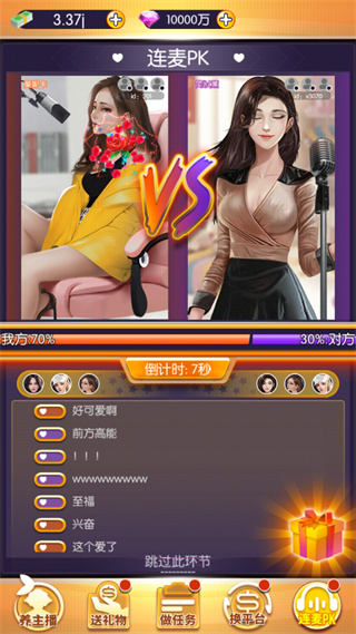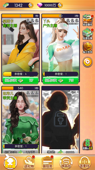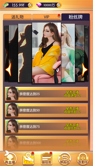 随着短视频平台的崛起,很多用户现在也是加入了主播行业,每天开着直播跟粉丝唠唠嗑,或者是打打游戏,偶尔还能赚点外快,也不失为一件不错的事情。当然啦,主播可不是那么好当的,除了你自身得拥有才艺之外,还得靠后面的公司推动,否则的话流量也就那么一点。而如果换做你是公司领导者的话,你又会怎么推动你旗下的女主播呢?今天,这款我的女主播最新版游戏就将告诉你答案。该游戏是一款很好玩的主播经营模拟类游戏,在这里我们将扮演一名经纪公司里面的领导人,然后需要招募一些女主播到自己的旗下,接着就是不断地砸礼物,将主播的人气提高,从而获得更多的粉丝,更多的流量。而当我们手下的女主播达到一定的数量之后,我们还可以选择与其他的主播进行PK,从而进一步提高自家主播的名气。总的来说玩家将在这里体验到一个全新不一样的主播养成体验,而且里面还有着新颖独特的玩法内容,绝对满足大家的各种游玩需求,有需要的用户一定要下载体验哦!