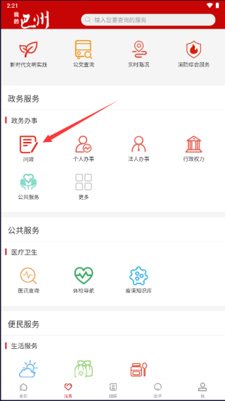 一、打开“我的巴州”手机APP(小程序),点击上方【问政】图标。