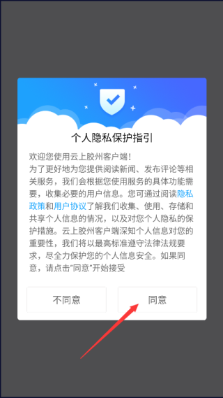 第一步,打开手机页面“云上胶州”APP,阅读“用户使用许可协议和隐私政策”,点击“同意”: