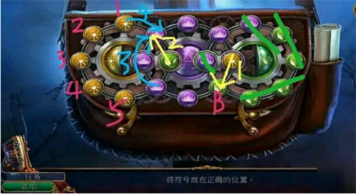 再根据图三步骤、转动即可。①把中间圆圈上的太阳(肯定在中间圆圈上,位置随意)、转到B处,②左边太阳圆圈、逆时针转1,③中间圆圈,顺时针转2,④左边太阳,顺时针转1。