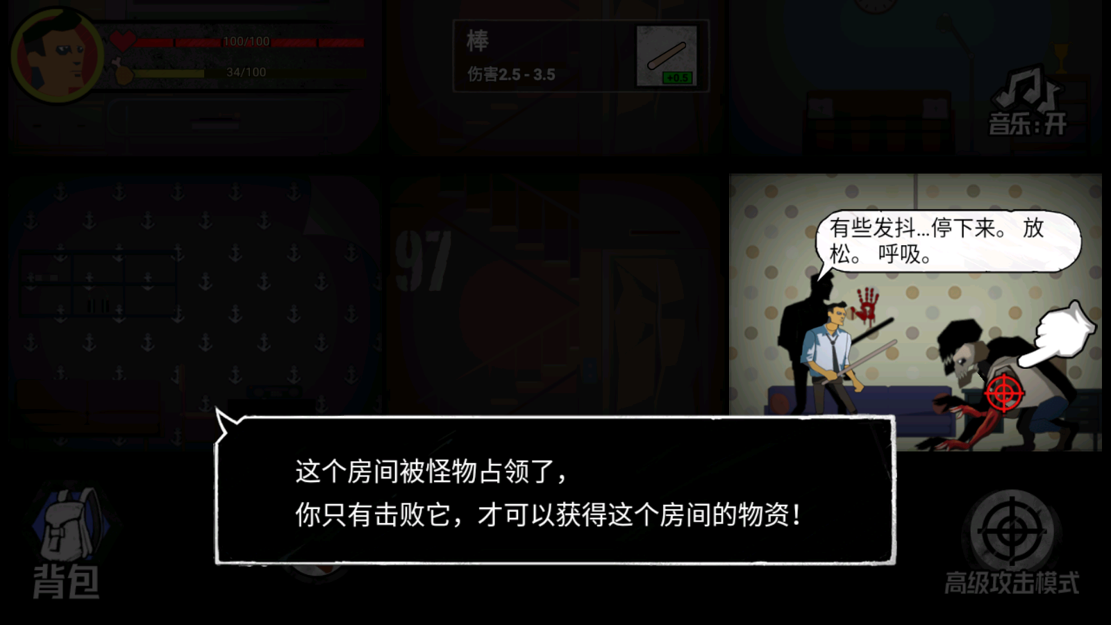 4、有的房间里有怪物,你需要用武器击败它,才能获得房间内的物资。