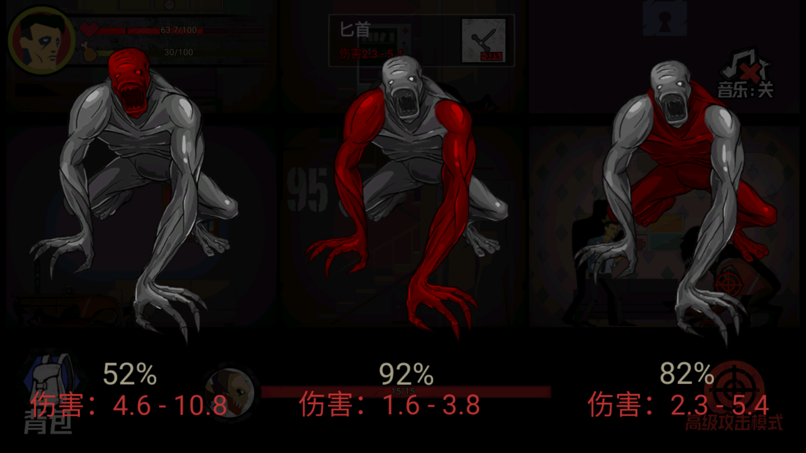 5、对怪物可使用3种攻击方式,攻击的位置不同,伤害也不同,伤害越高的部位击中概率越低。