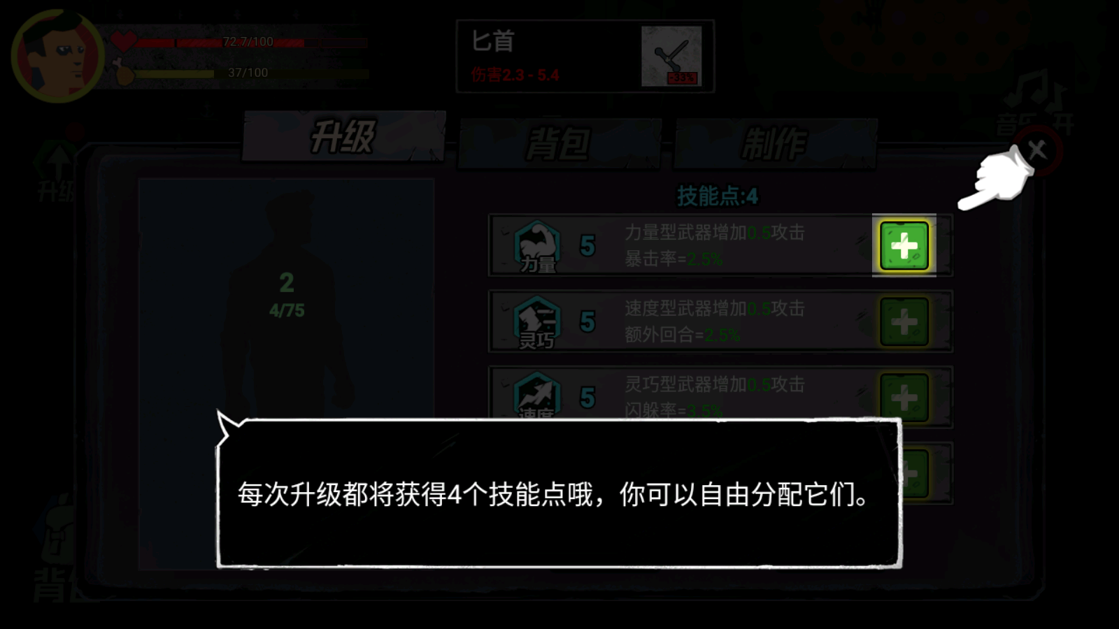 3、点击背包可以装备武器和使用食物和药品。