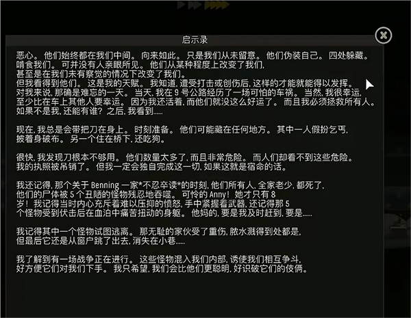 结局一:世界观,首次进入游戏会播放一段动画,大意是欧美和东方(个人感觉就是亚洲)进行战争,但是东方投下了生化武器,大家都变异了,而外出的主角为了活着出去见到女儿必须从一百楼杀出去。