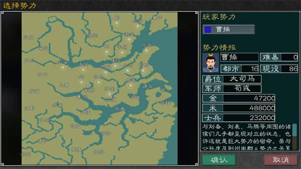 2、在选择了剧本后,我们就要选择势力,其实也就是主角选择,跟红警里面的国家选择有一定相似,每个势力都会有不同的武将供玩家开发。初次体验时,建议大家还是选择一些比较强势的势力,例如曹操、孙权等,不然很有可能陷入死局而玩不下去。