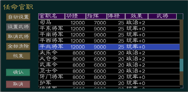 在任命这方面,功绩是一个门槛,即该武将的功绩不能低于该官职的所需功绩。