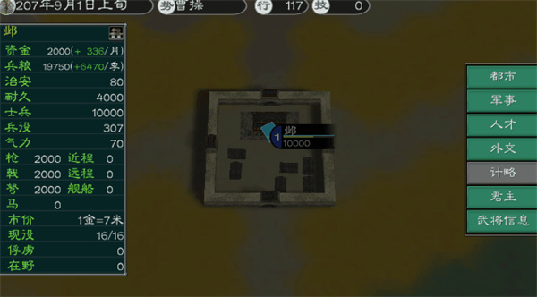 3、在开局初期,基本上是没有什么战争会发生,我们只需要无脑去建设各种建筑即可,如果建筑的按钮灰掉了,说明当前没有武将可以去派遣该建设任务,我们就可以选择其他的行动,例如治安、征兵、出征等。