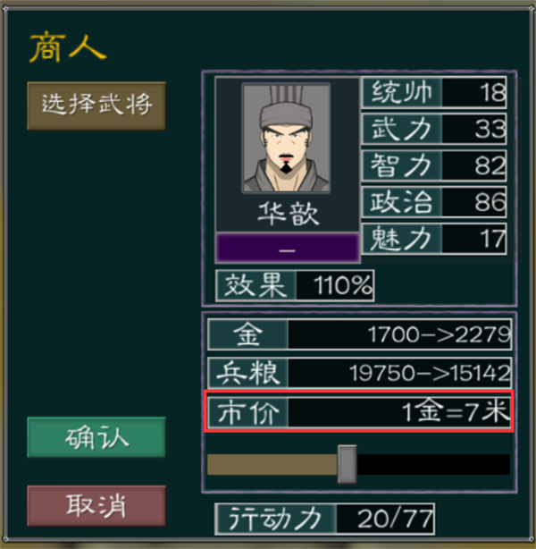 在英雄的黎明2中,商贸系统比较简单,其实就是低买高卖,赚一个差价,可以通过红框位置,直观的看到目前一金可以买多少米。一般来说,游戏中大多数都是卖粮情况比较多。