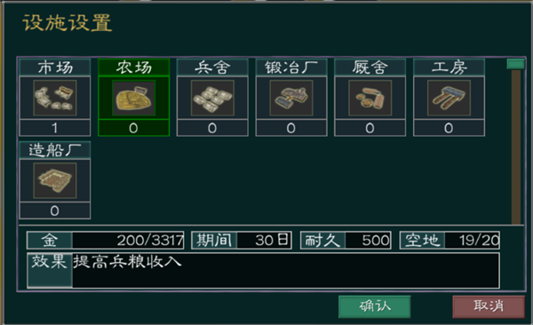 在人员配备齐全后,我们的第一步就是要开发我们的城池了,每种建筑的功能均不相同,我们要根据当前的需求来进行选择。同时也可以看到,开发城池是需要行动力的,一次要20点。