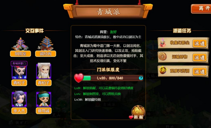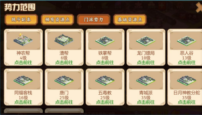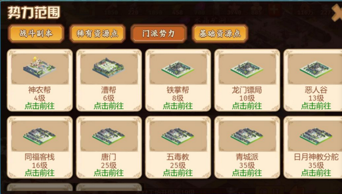 此外,掌门还可前往武林地图中点击势力,选择各个门派进行门派派遣任务,完成收集资源或其他事件,不仅有几率获取大量金币,也能获取门派信物。