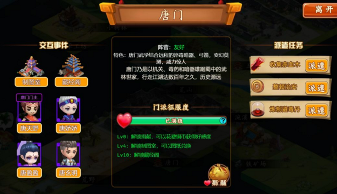 唐门:收集赤血木(3次/天)、整顿治安、炼制避毒丹(3次/天)