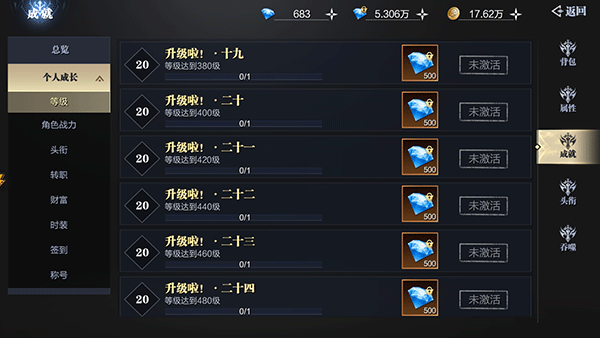 成就系统按照个人成长,战灵,进阶,装备,日常,限时活动、社交七大类进行了划分,每个类目下面又按照不同维度划分出了不同小标签,几乎涵盖了玩家在游戏里每一个阶段的进程,以个人成长为例,几乎每提升20级就能收获500的绑钻,在前期飞速升级的阶段,至少能为玩家提供上万的绑钻,这也意味着玩家可以用这些绑钻,购买各种礼包,道具。战力飙升的不要太轻松。