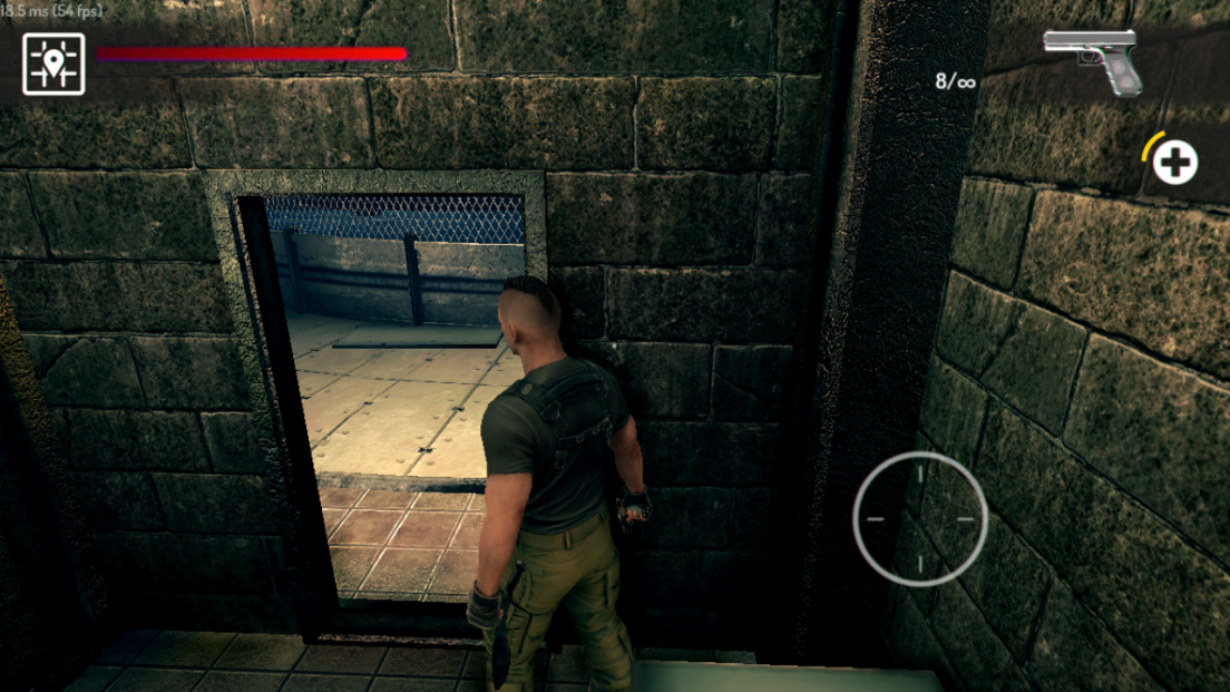 5、动画结束以后,玩家就会一个小房间,滑动左边的空白处可以控制角色的移动,右边则负责瞄准射击;首先,走到门口处;