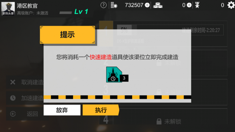 为了节省时间,我们这一次将使用快速建造道具立即完成该战舰的建造。快速建造指令可以通过每日任务获得,也可以直接在军需处购买。