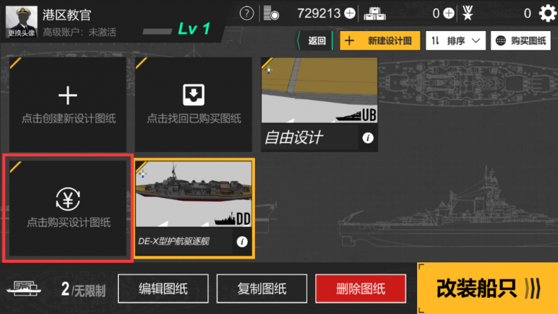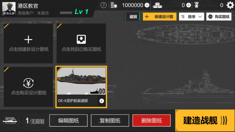 当您第一次进入港区时,您会获得一张“DE-X型护航驱逐舰”的图纸。您可点击右下方黄色”建造战舰“按钮直接进行建造,但在此之前,我们建议您自行设计战舰以体验工艺战舰的全部乐趣