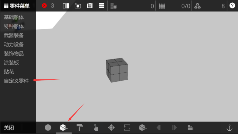 这八个方块即是您的图纸的初始内容,当您逐渐熟悉游戏后,可以尝试这样从零开始。作为初学者,我们建议您可以试试”自定义零件“这一便捷方式进行设计。