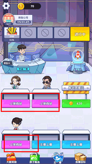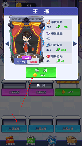 玩这个游戏需要一步步来:先用金币解锁货架,然后签约主播开始直播带货,上架商品才能让主播有东西卖。游戏亮点包括能获得成就称号,甚至被厉害的平台签约,还能在排行榜上排名,赚金币买豪宅、跑车什么的。每次开播前还能设置房间标题和画质,和粉丝互动吸引更多人观看。
