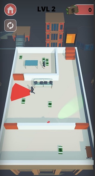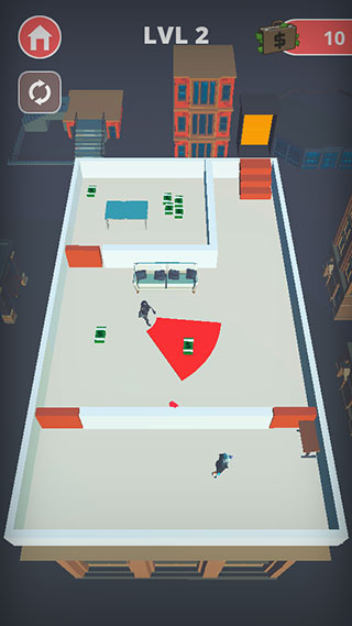 不可能的抢劫2是一款卡通风格的趣味休闲闯关类小游戏,在这款游戏中玩家将要操纵一名小偷前往各个关卡场景内展开一场冒险偷窃,期间我们需要避开地图中所有的监控设备和警察,这样才能够让自己顺利的完成窃取抢劫的工作,警察前方的红色区域就是他的可观察区域,只要不在那里,你就不会被发现,当收集一定钱币时控制角色通过逃生门后即可完成闯关并解锁下一关卡。游戏在前期还是相对简单一些的,但随着关卡的不断增加,其难度也会逐渐增加,感兴趣的小伙伴们欢迎在本站下载体验。