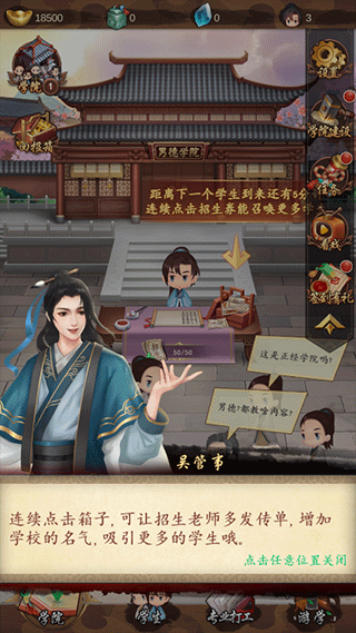 2、连续点击箱子可让招生老师多发传单,增加学校的名气