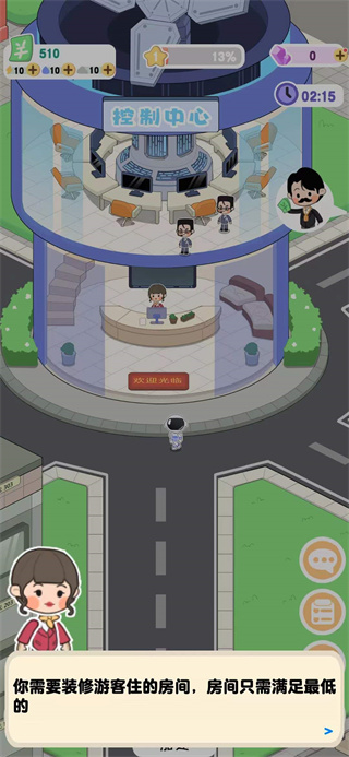 1、进入月球度假村模拟器最新版之后,前期会有小助理指导你经营。
