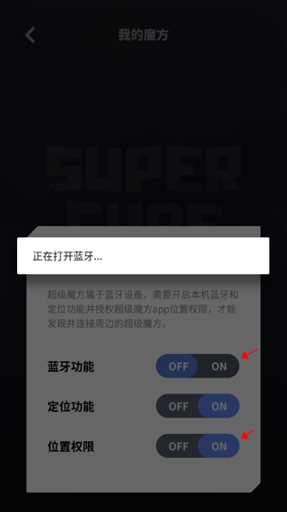 3、页面会弹出一个小窗口,要想连接超级魔方,需要开启蓝牙功能和位置权限,不然会匹配不到魔方,要记得将软件和魔方放近一点,蓝牙匹配到魔方就可以连接了。