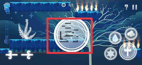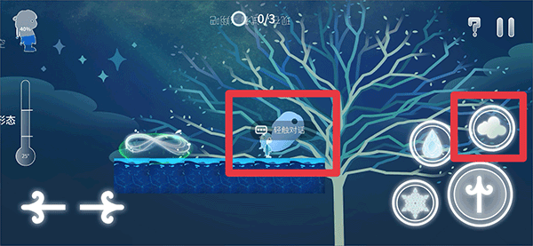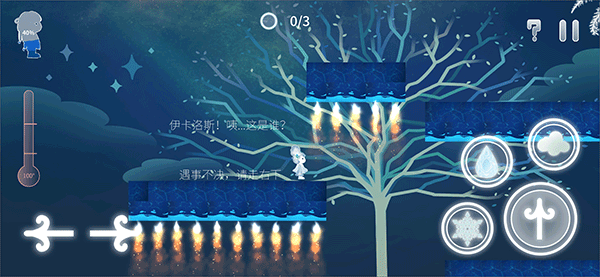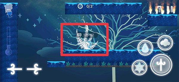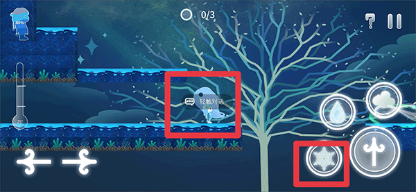 4、冰形态解锁后将角色切换至并形态,并利用跳跃箭头按钮和左右箭头按钮来操控角色向上前进,一直到此后轻触对话唤醒气形态