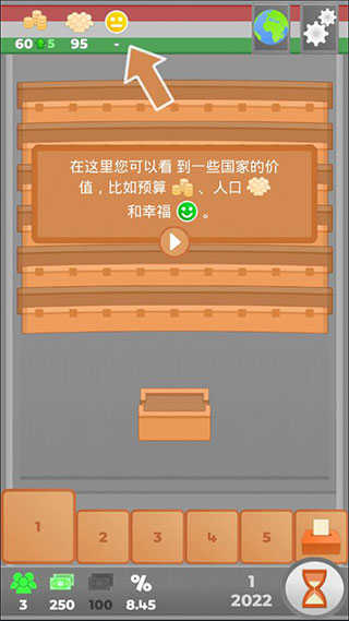 5、在左上角这里,您可以看到国家的一些价值,比如预算、人口和幸福。