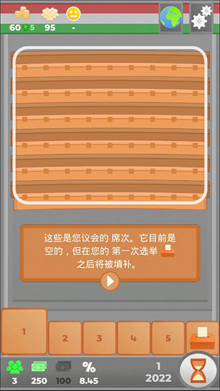 6、中间这些是您议会的席次。它目前是空的,但在您的第一次选举之后将被填补。
